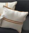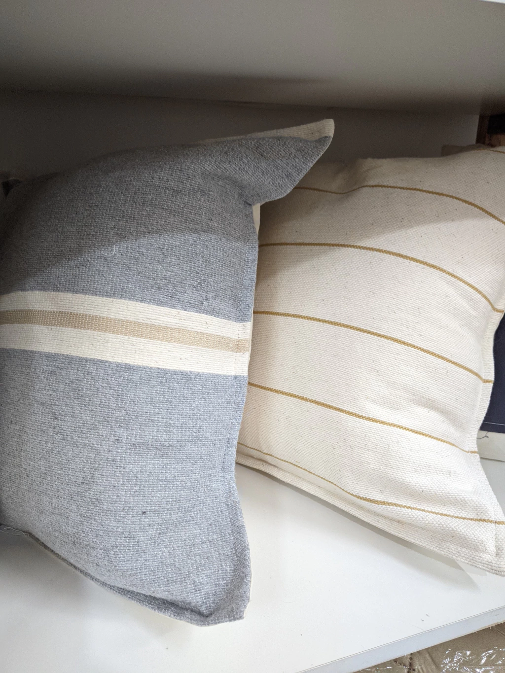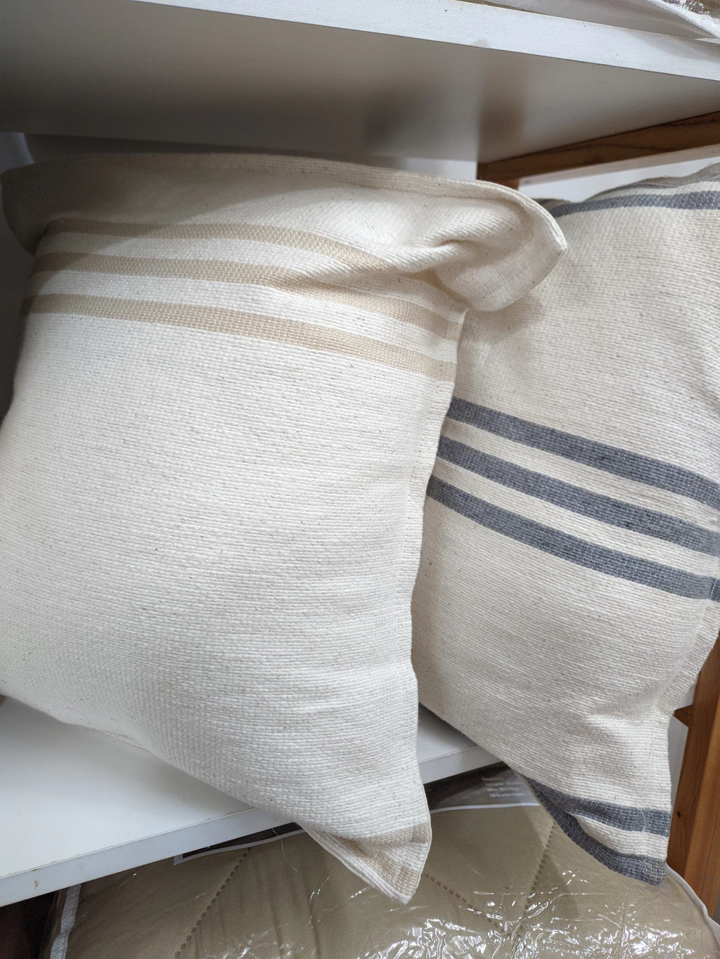 Dale vida a tu hogar con nuestro Almohadón con Funda y Líneas Trazadas en dos vibrantes combinaciones de color: Azul con Naranja y Beige con Naranja.