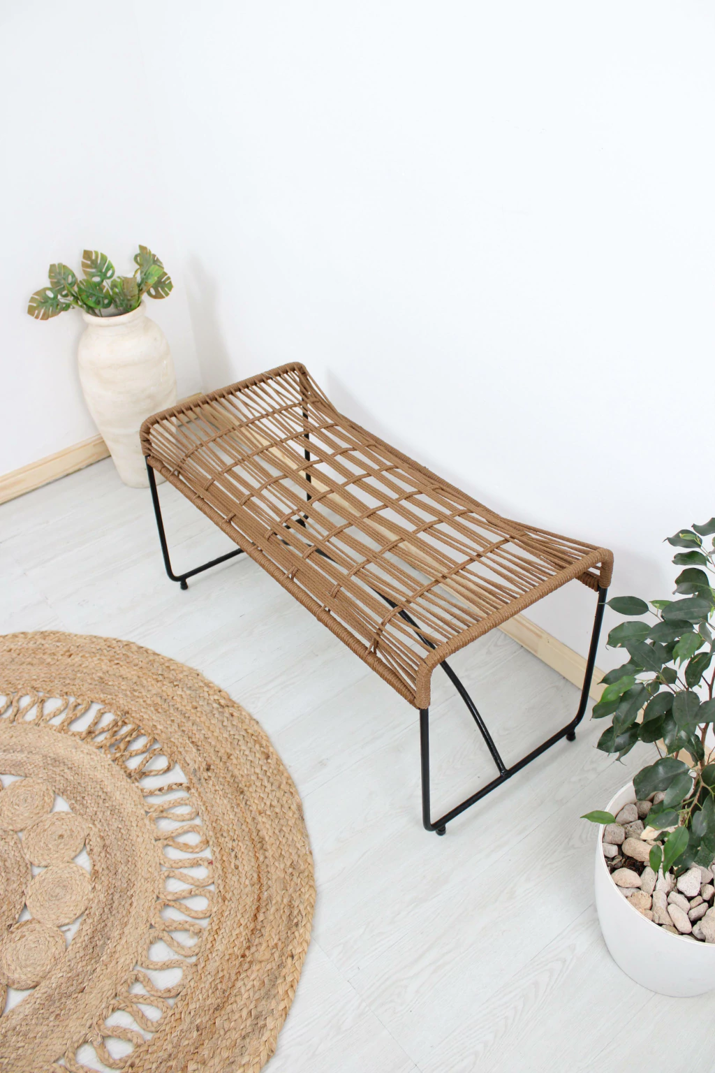 Hecha a mano en hierro reforzado y tejido simil yute, son resistentes para exteriores como terrazas, balcones o jardines.