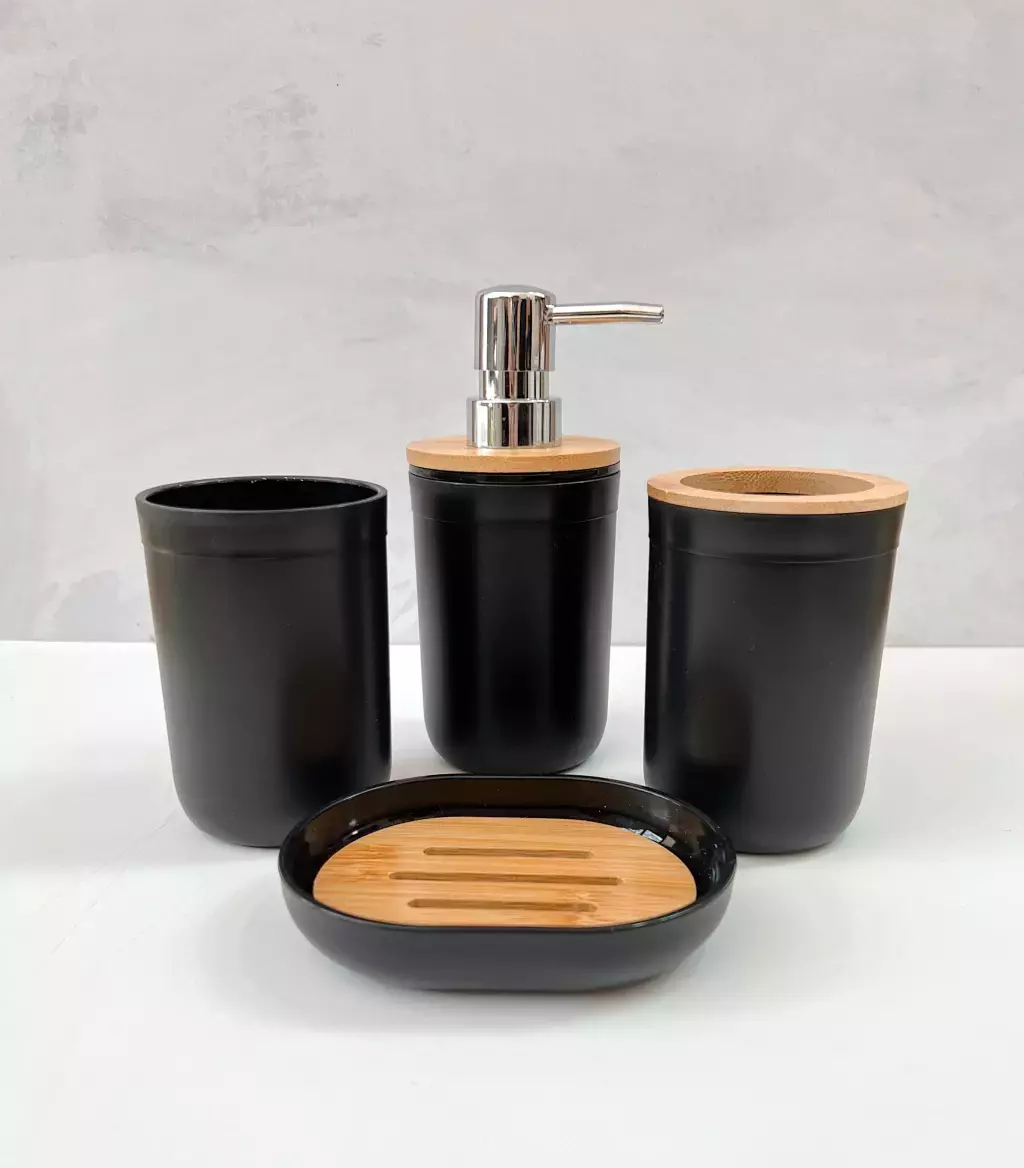 Transforma tu baño con el elegante Set Dundee, compuesto por 4 piezas de plástico con detalles en bamboo. Este set incluye:
